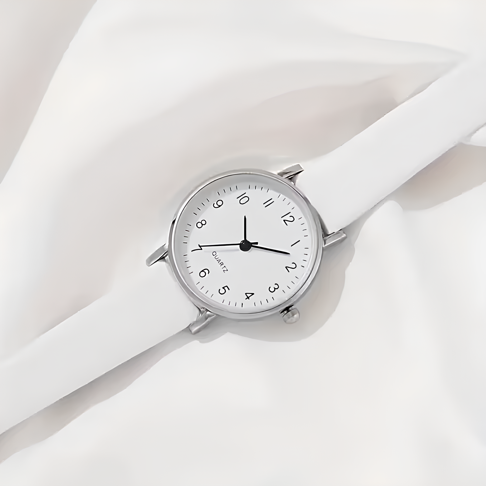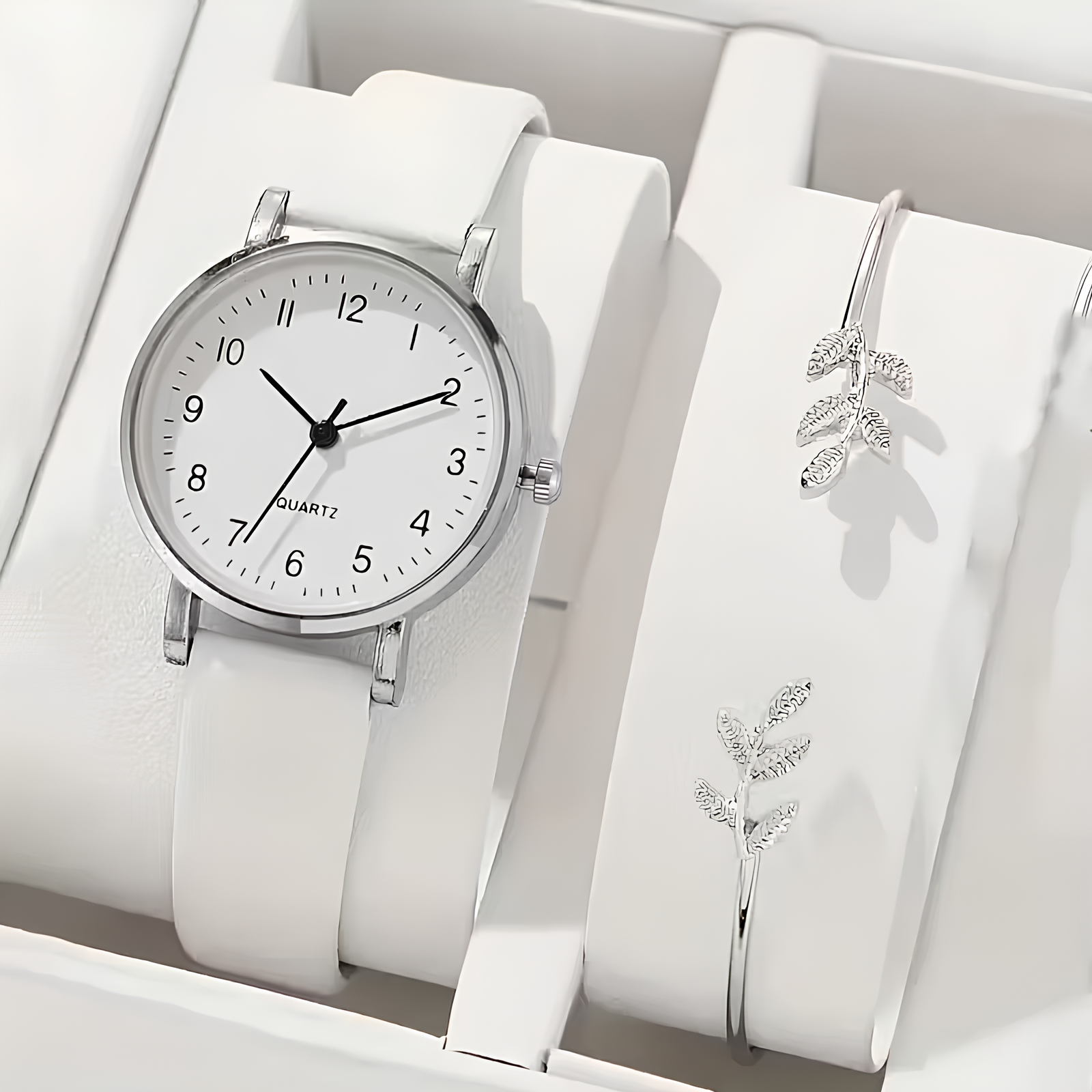 Dilove Kadın Kuvars Saat & Bileklik Seti – Beyaz Deri Kayışlı Şık Kombin