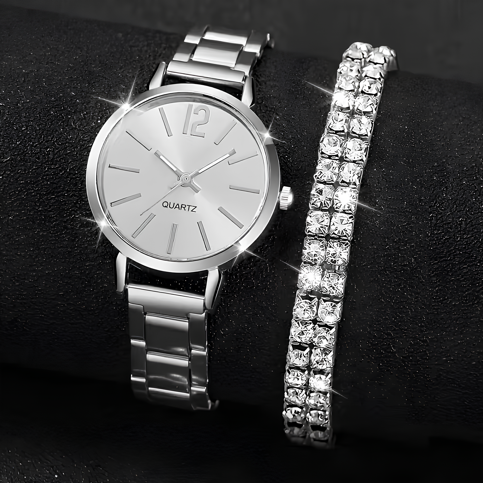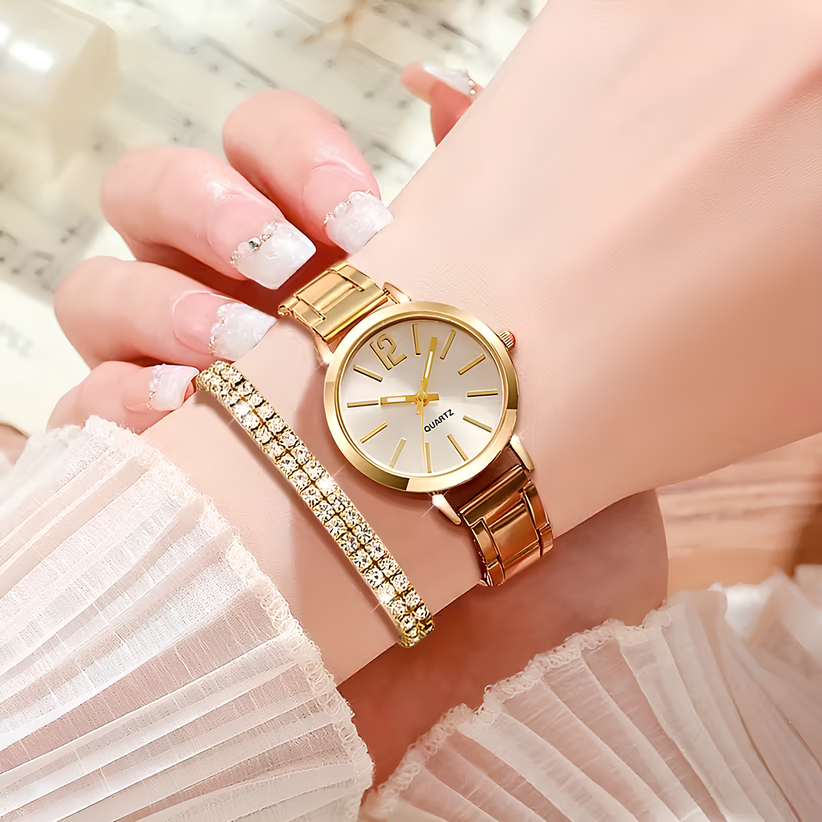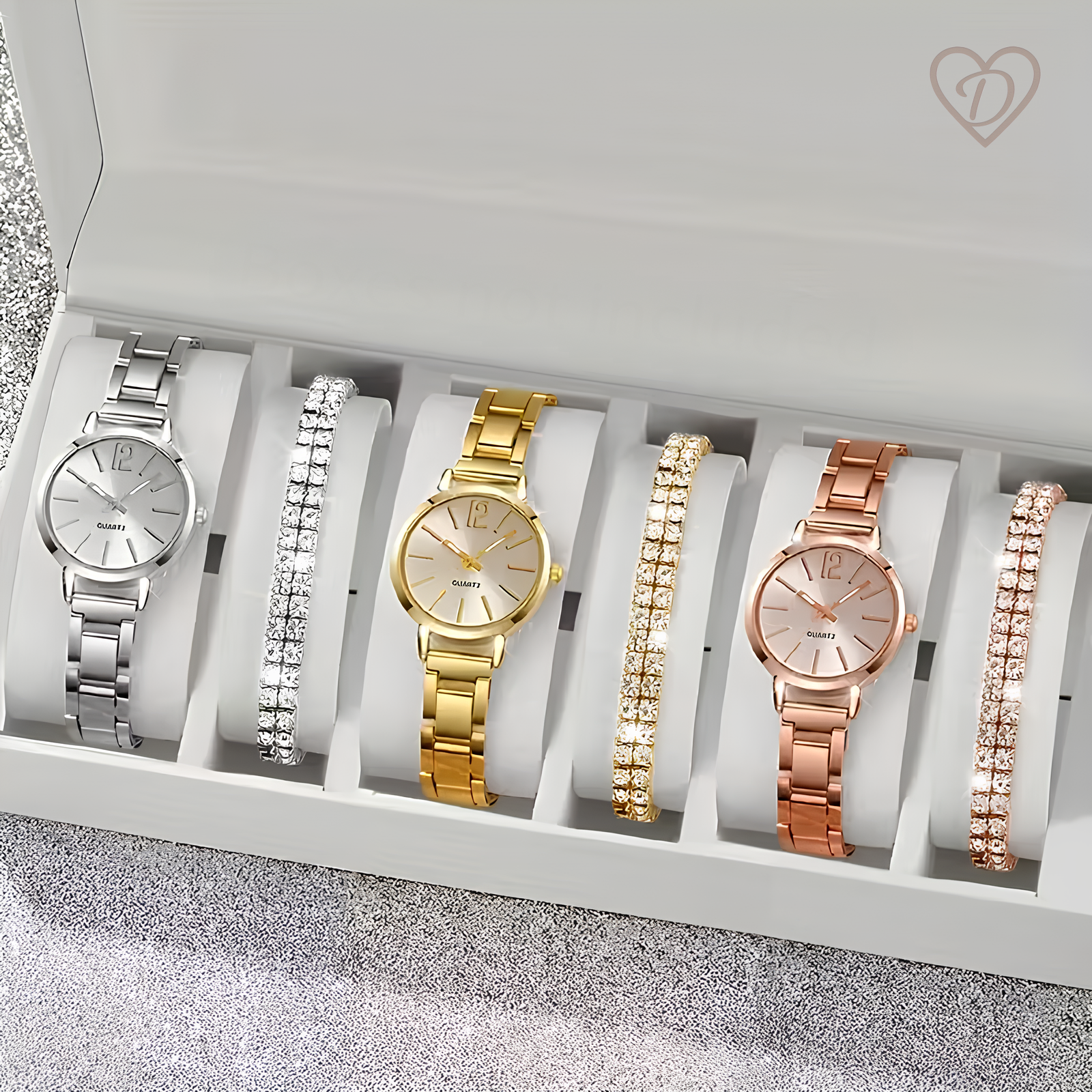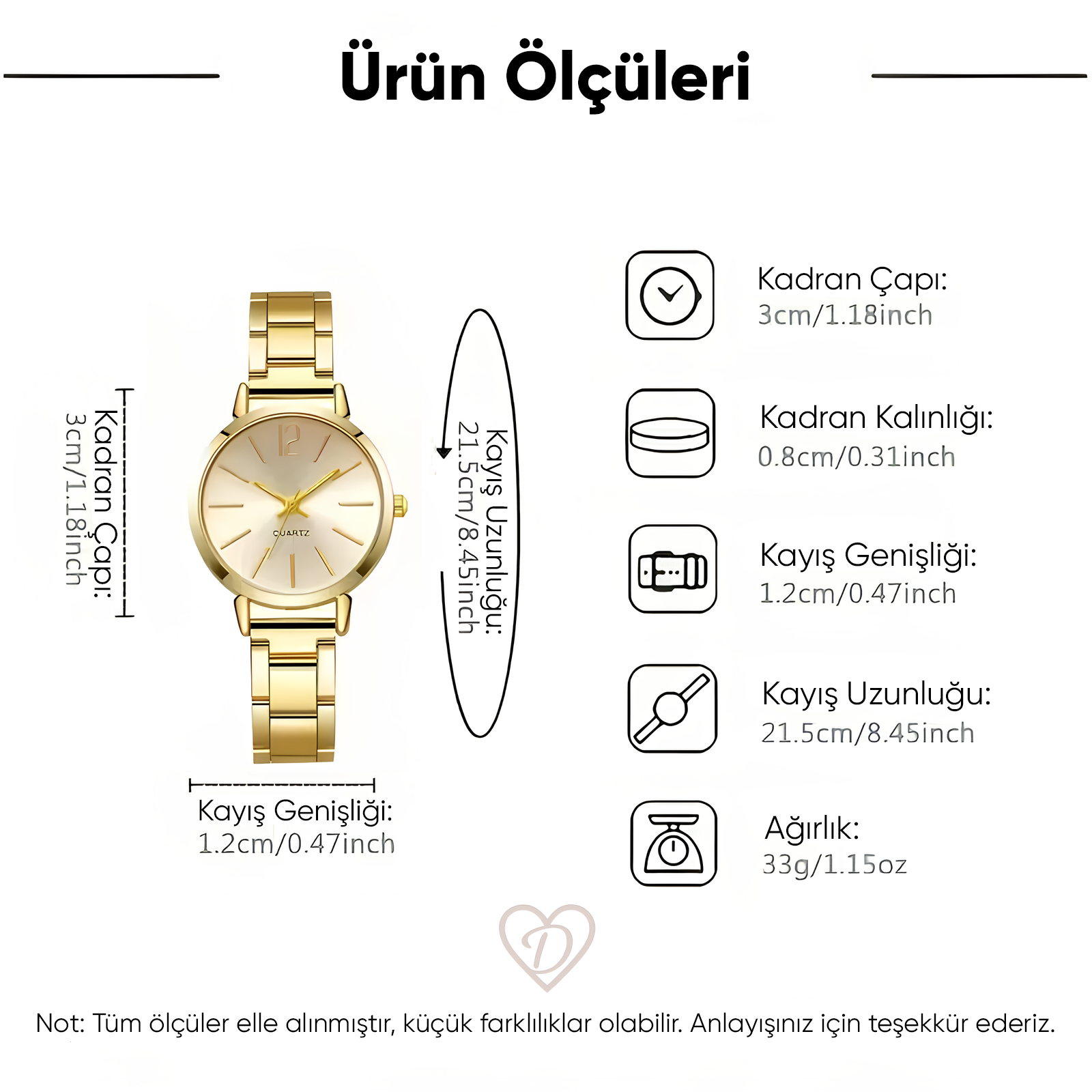 Dilove Lüks Kadın Kuvars Saat Seti – Metal Kordonlu 6’lı Takı Seti