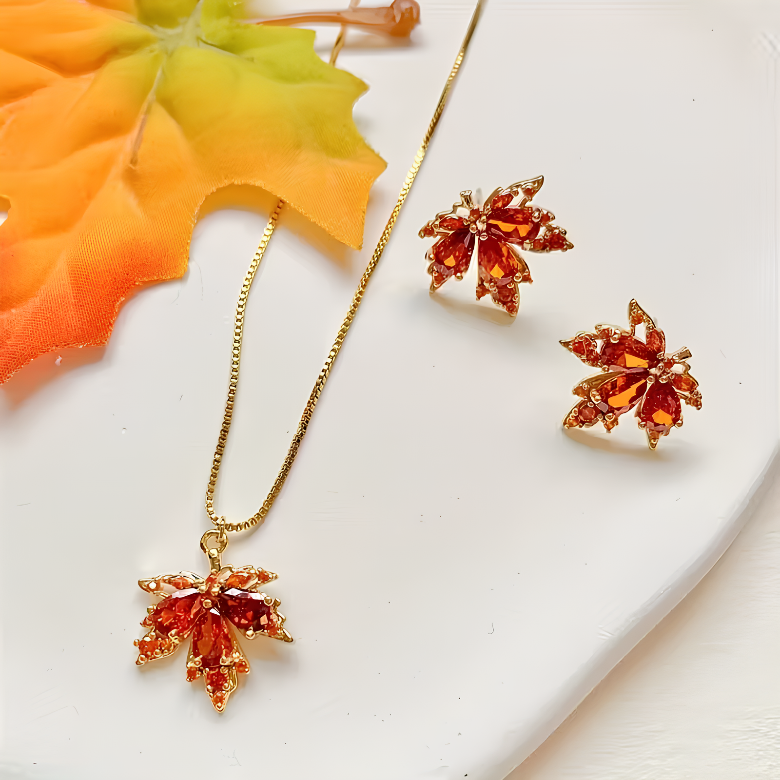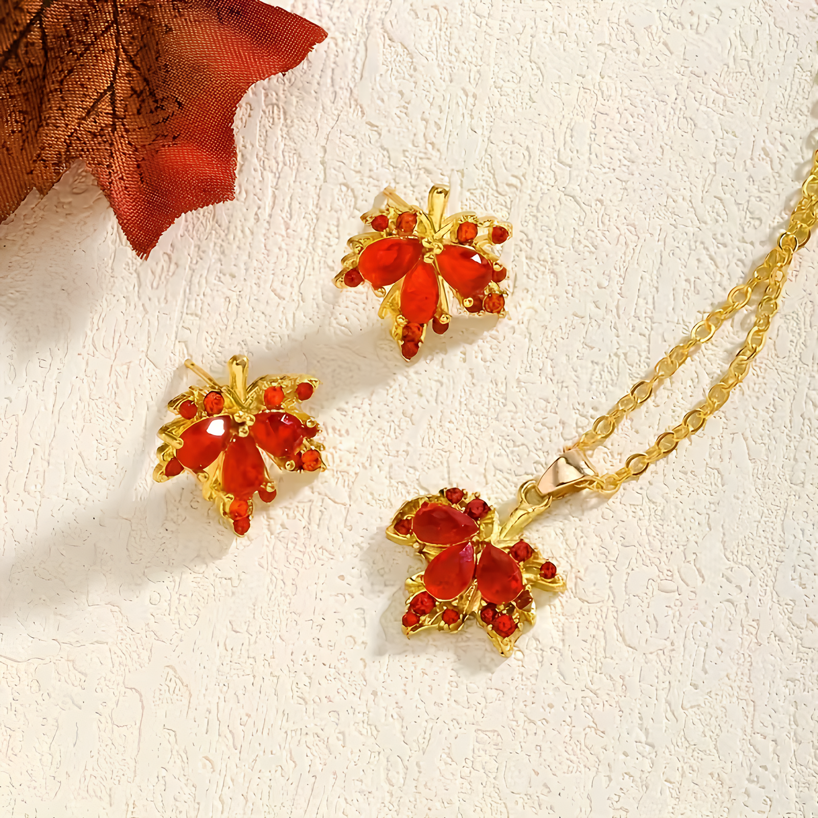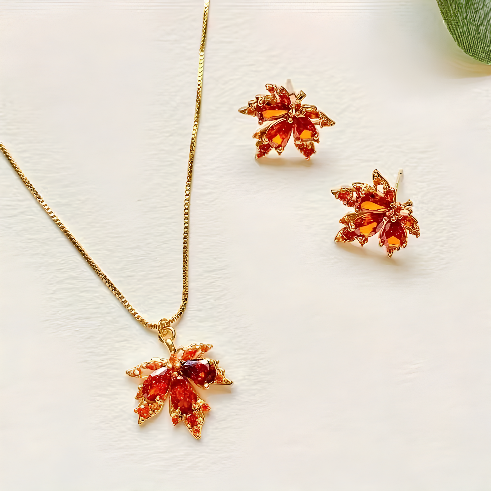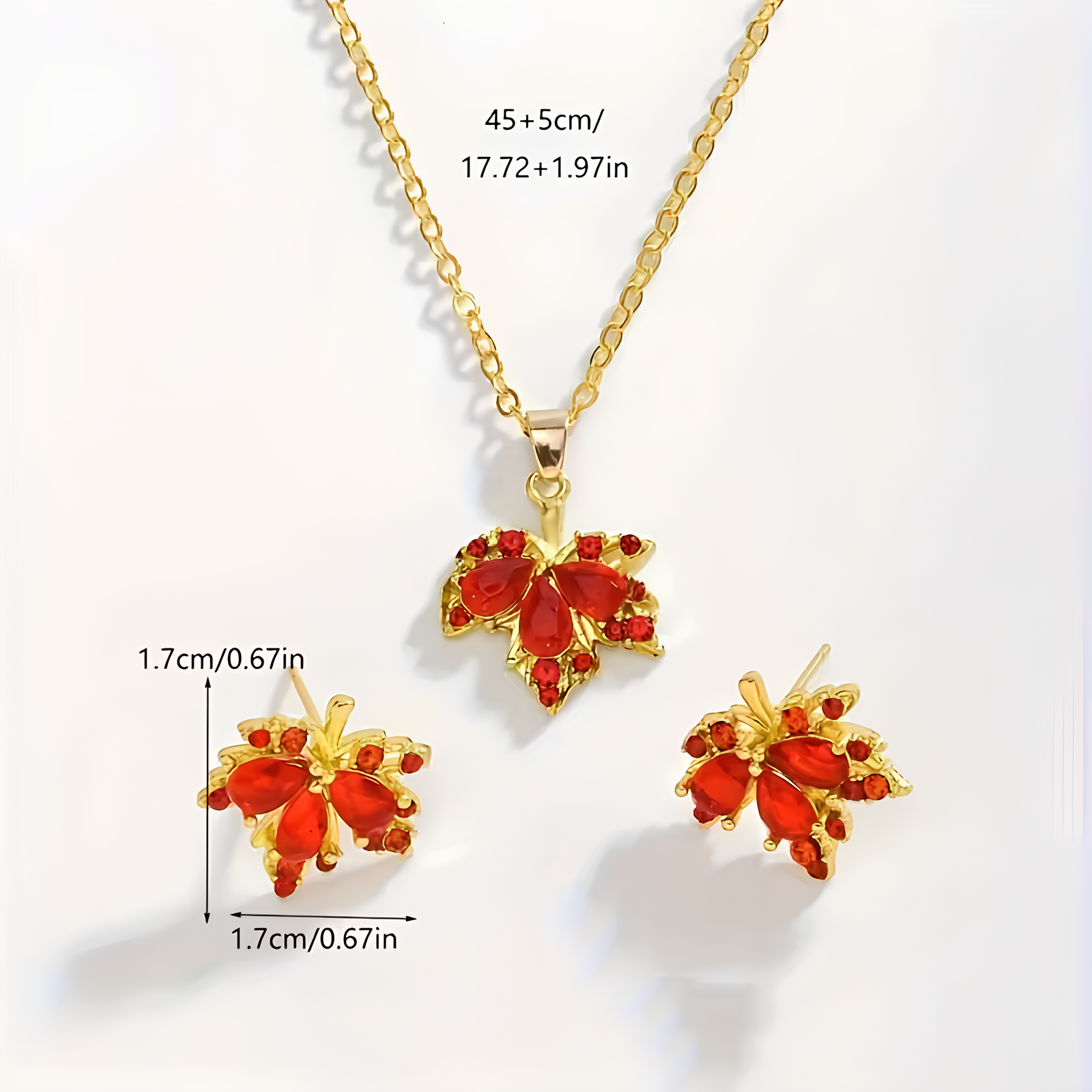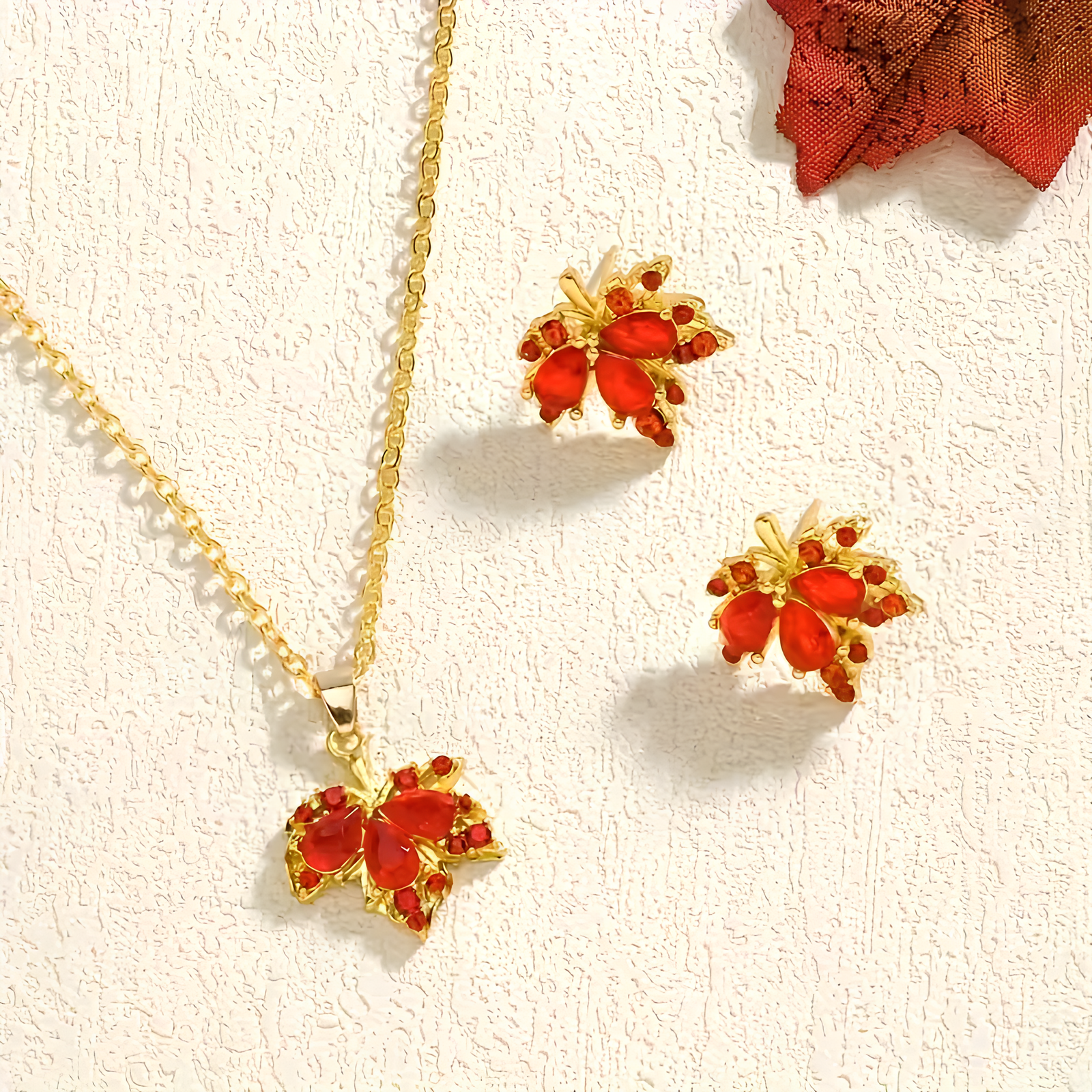 Dilove Zarif Yaprak Takı Seti – Kırmızı Taşlı Kolye ve Küpe