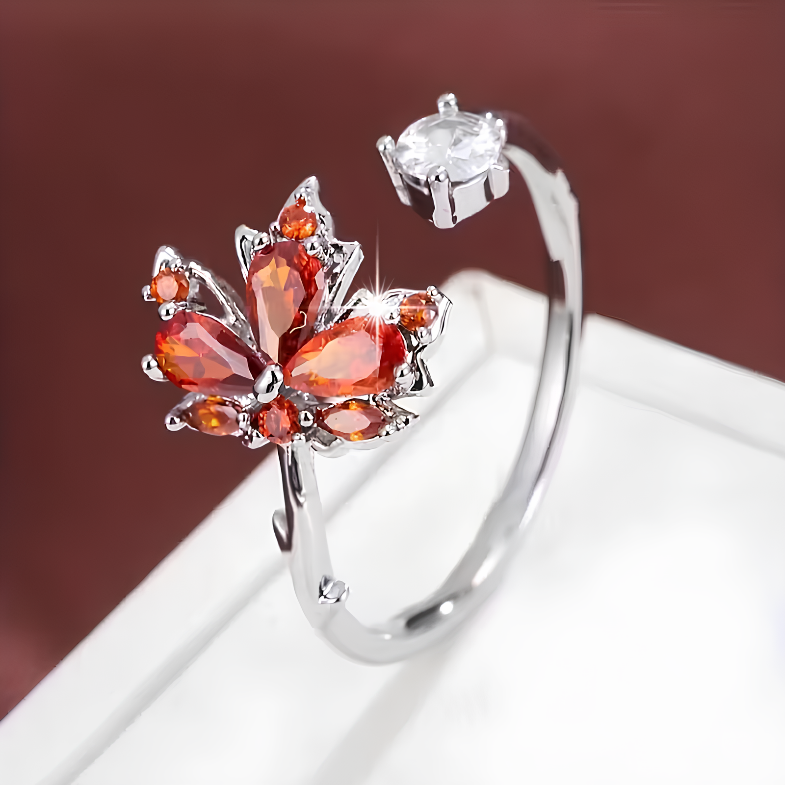 Kırmızı & Altın Yaprak Kadın Yüzük – Modern Zirkon Taşlı Ayarlanabilir | Dilove