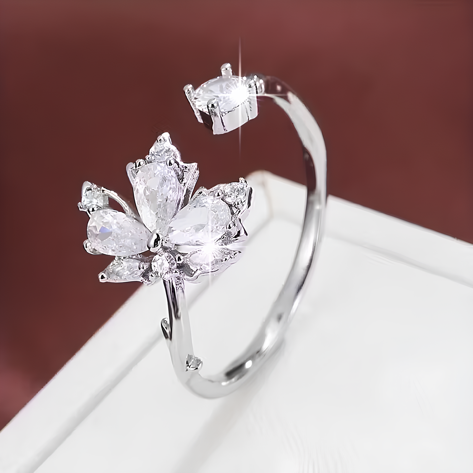 Beyaz & Gümüş Yaprak Tasarım Kadın Yüzük – Zarif Zirkon Taşlı Ayarlanabilir | Dilove