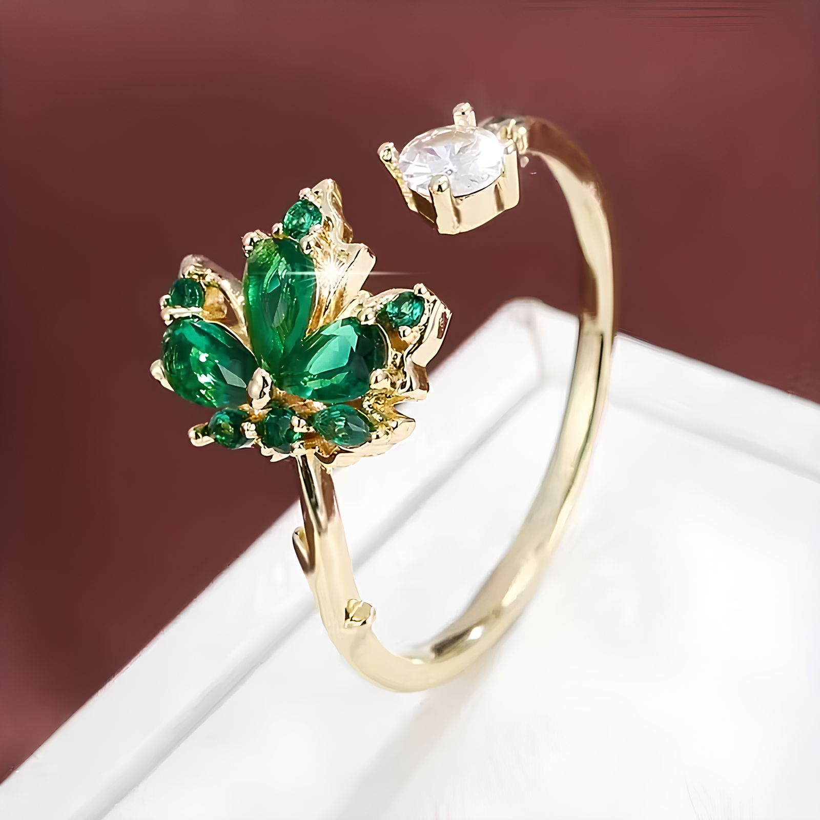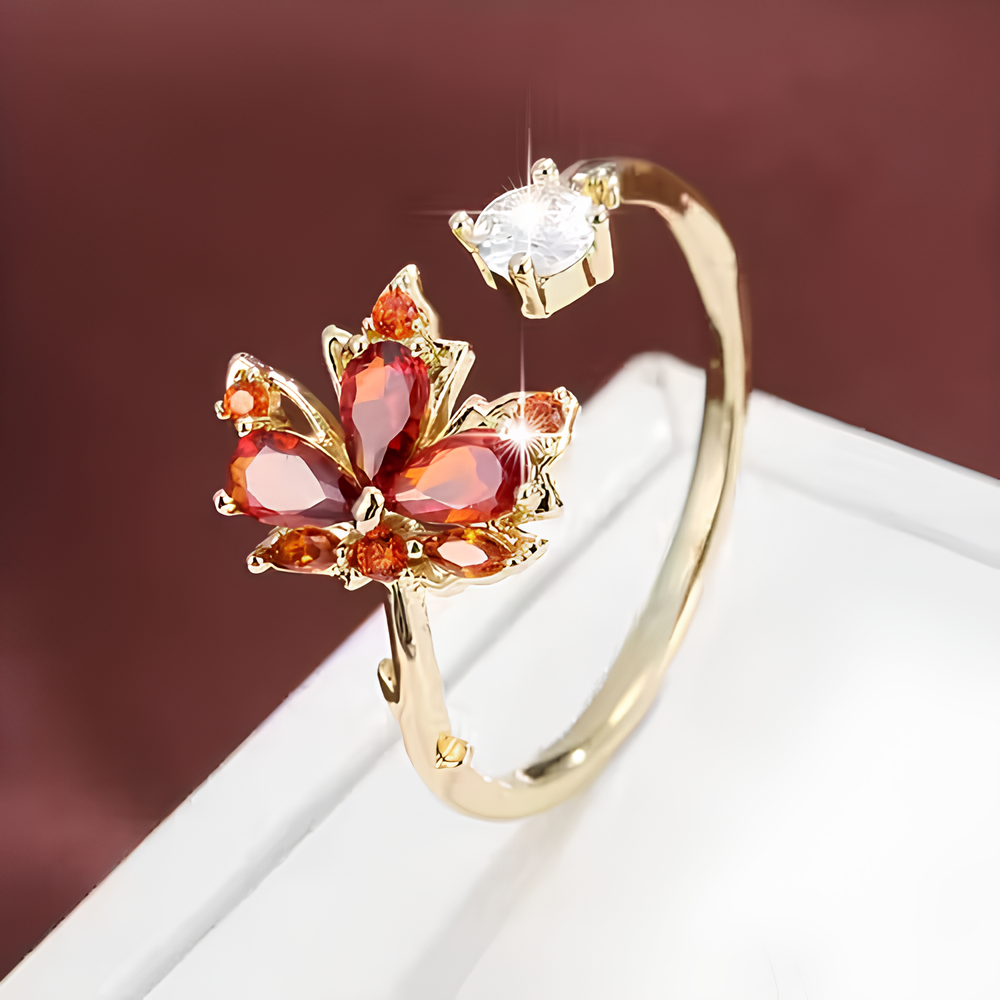Kırmızı & Gümüş Yaprak Tasarım Kadın Yüzük – Şık Ayarlanabilir Yüzük | Dilove