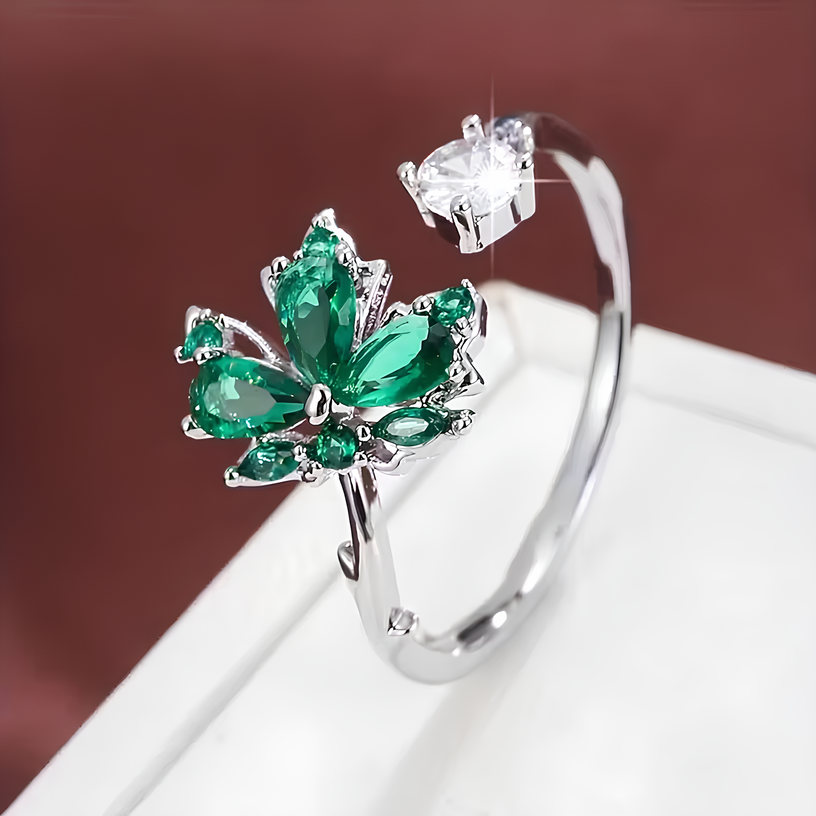 Yeşil & Gümüş Yaprak Tasarım Kadın Yüzük – Ayarlanabilir Zirkon Taşlı | Dilove